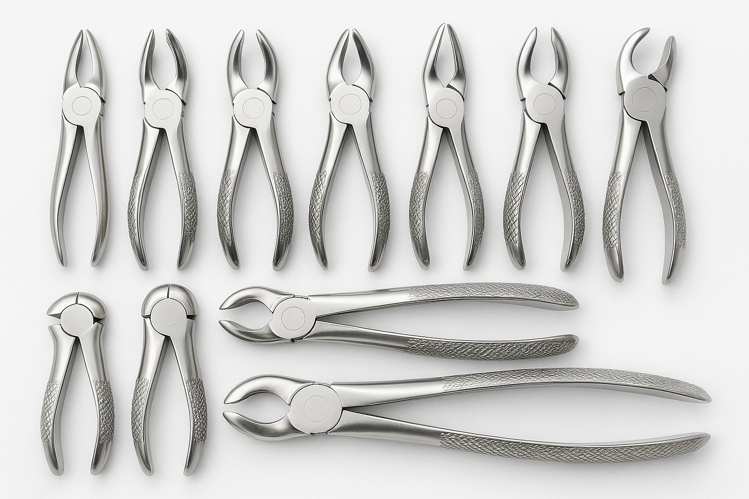A complete set of dental extraction forceps designed for removing different teeth with precision, durability, and patient comfort.